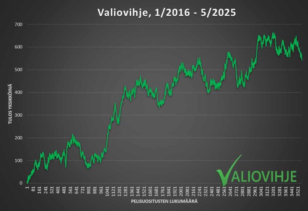 Kauden 2025 – 2026 aikana pelattavaa löytynee noin 2050 yksikön edestä. Odotettu tuotto per pelisuositus on keskimäärin 3,0%, joten ennakoiduksi kausituotoksi saadaan noin 60 yksikköä. 20 euron yksikköpanoksella Valioliiga-kauden odotusarvoinen tuotto olisi siis noin 1 200€ ja 500 euron yksikköpanoksella 30 000€.